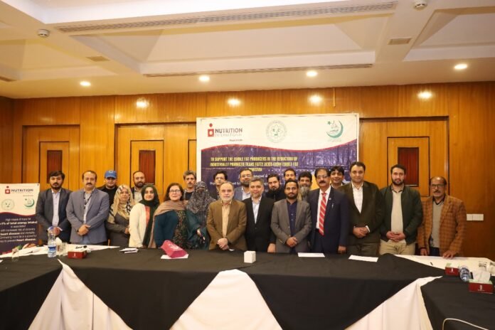 The Department of Food Science and Technology, University of Karachi, in collaboration with Nutrition International, organized a specialized training session in Islamabad held at Margalla Hotel focusing on the elimination of industrially produced trans fatty acids (iTFA) from edible fats and oils. The session brought together manufacturers from leading edible fat industries, as well as officials from the Islamabad Food Authority, AJ&K Food Authority, GB, Baluchistan Food Authority, PANAH delegate and Heart File.