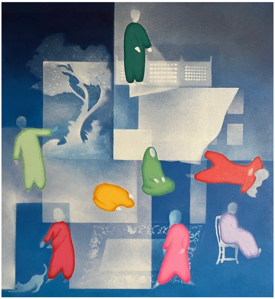 The work subtly an atmosphere of devotion and introspection. Painted in deep midnight blues and soft shades of blue, the scene evokes the calm of moonlight and the stillness of the late night. The presence of prayer mats and carpets further anchors the composition in a space of spiritual reflection. Through this layered arrangement of figures and gestures, Obaid creates an ethereal ambiance where everyday life and quiet spirituality gently intersect.