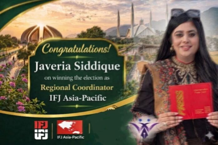 Islamabad – 14 April 2026 (Adnan Hameed) : Pakistani journalist Javeria Siddique has been elected to the International Federation of Journalists Gender Council for the term 2026–2029 and will serve as the Regional Gender Coordinator for IFJ Asia Pacific.