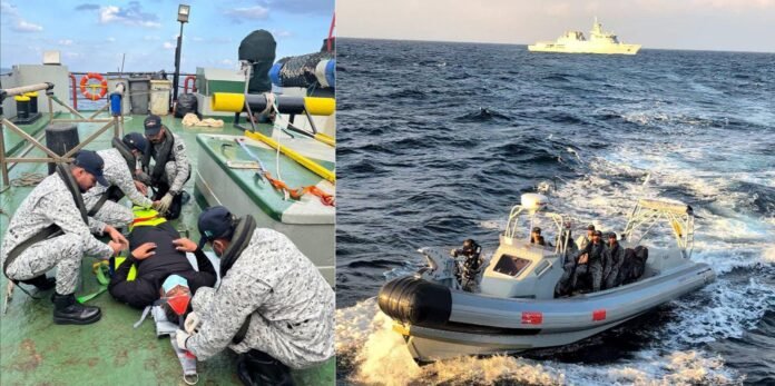 ​Islamabad – 24 January 2026 (MT Team) : In a swift humanitarian operation Pakistan Navy Ships TABUK and MOAWIN have successfully conducted medical evacuation (MEDEVAC) of a Sri Lankan national requiring urgent medical attention on an Indonesian Flagged, MV GREY PALM on the high seas at 800 Nautical Miles (approximately 1500 KM) off Pakistan’s coast.