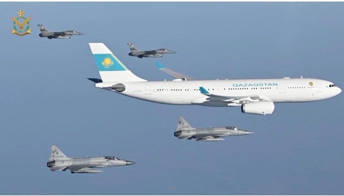 A six-aircraft formation escorted the Kazakh President upon his entry into Pakistani airspace, symbolizing Pakistan’s warm hospitality and fraternal ties.