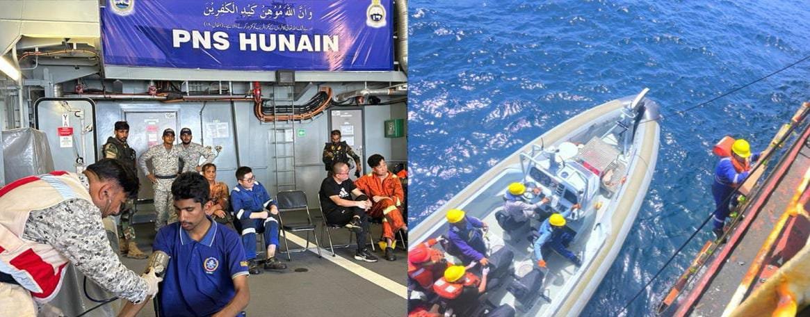 PNS HUNAIN conducted a Search and Rescue operation with high professionalism and expertise. The ship’s team of specialists provided medical aid, assisted in firefighting, carried out damage assessment, and successfully rescued the crew. The evacuated crew were safely transported to Karachi for medical care and repatriation to their respective countries.