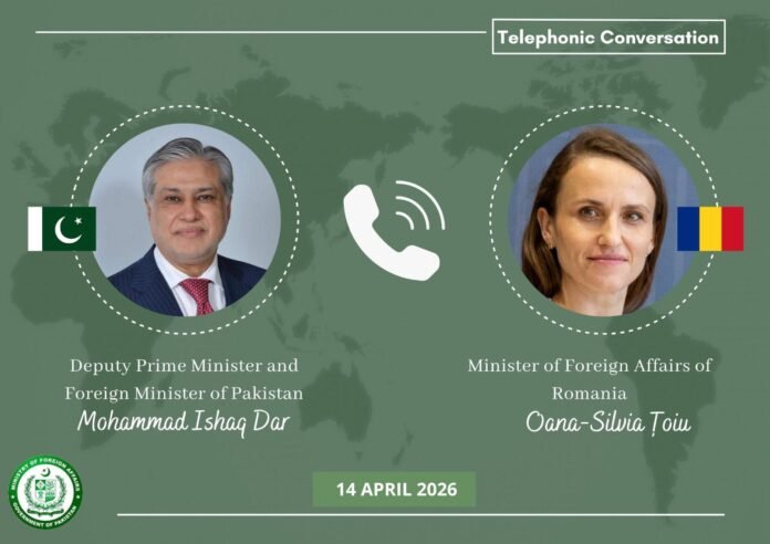 Islamabad – 14 April 2026 (Adnan Hameed) : Deputy Prime Minister / Foreign Minister Senator Mohammad Ishaq Dar today received a telephone call from Romanian Foreign Minister Oana-Silvia Toiu.