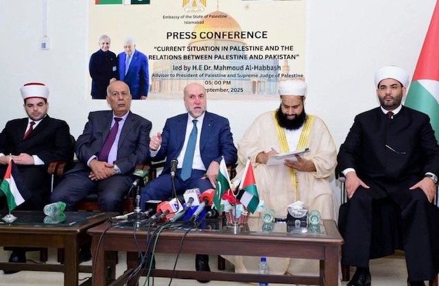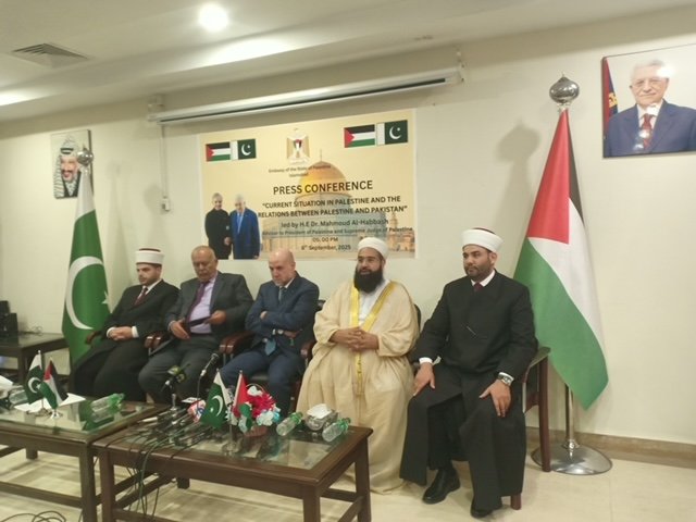 Islamabad: Dr. Mahmoud Al-Habbash, Adviser to the President of Palestine and the Supreme Judge of Palestine, has urged the people of Pakistan to extend their full support to their Palestinian brothers and sisters who are facing relentless Israeli aggression. He made this appeal while addressing a press conference at the Embassy of Palestine in Islamabad, where the Ambassador of Palestine to Pakistan, Dr. Zuhair and Imam of Masjid Al-Aqsa was also present.