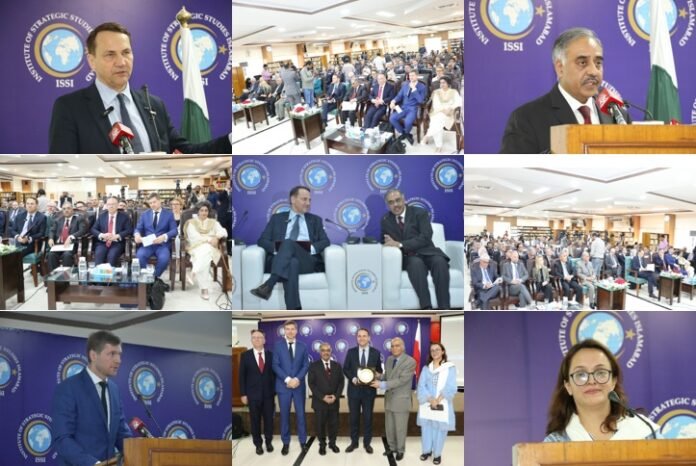 Islamabad – 23 October, 2025 (Adnan Hameed) : The Institute of Strategic Studies Islamabad (ISSI) hosted a Distinguished Lecture by Radosław Sikorski, Deputy Prime Minister and Minister of Foreign Affairs of the Republic of Poland, on the theme “Poland’s Success Story: A Message for the Rising Countries.” The event was organized by the Centre for Strategic Perspectives (CSP) at ISSI, in collaboration with the Polish Institute of International Affairs (PISM). The Lecture brought together diplomats, policymakers, academics, and representatives from think-tanks, civil society, and the media to discuss Poland’s remarkable journey of transformation and its relevance for developing and rising countries.