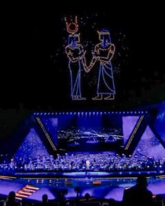 The opening ceremony began with an official group photograph of the attending delegations, followed by a musical symphony, accompanied by a drone and light show that illustrated the architectural harmony between the museum’s design and the Pyramids of Giza.
