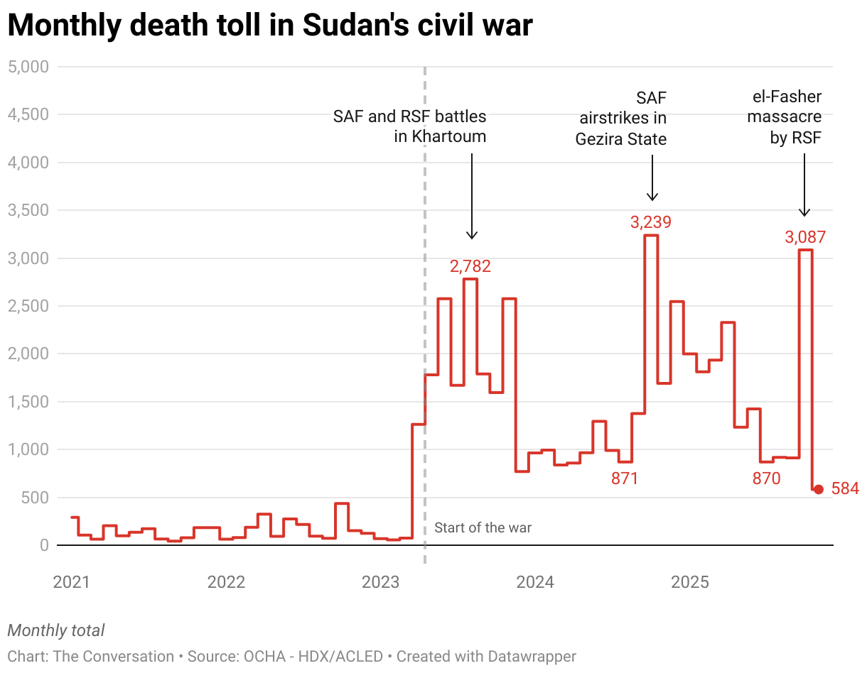 In all, Sudanese researcher Jihad Mashamoun estimates that as of November 2025, the SAF controlled 60% of the country. Meanwhile, the RSF has consolidated control over Darfur – the massive western region that has been a hub for gold mining and trafficking routes – and the regional capital of el-Fasher, an economic hub connecting routes to Libya to the north, the Nile to the east and Chad to the west.