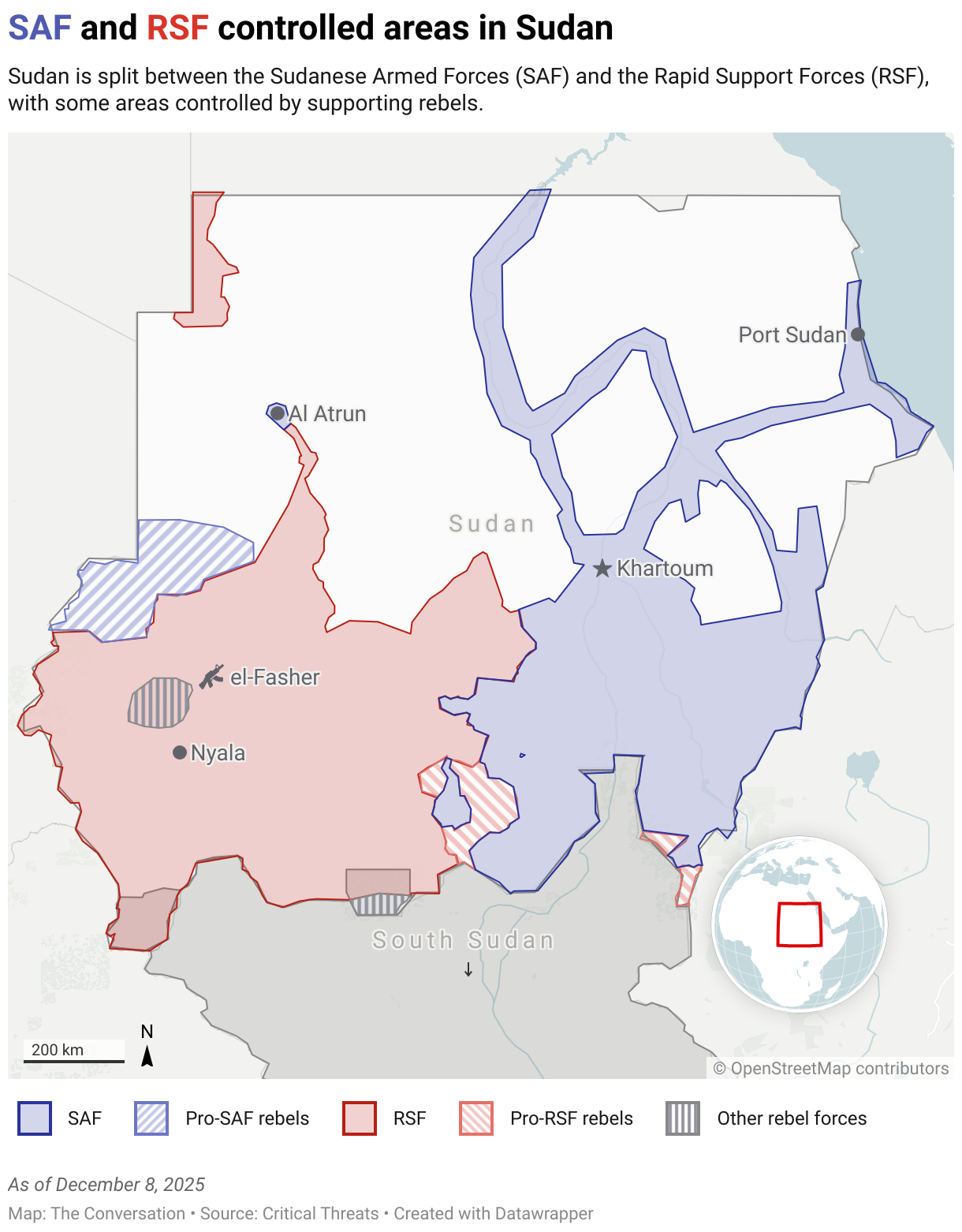 As of December 2025, the RSF and SAF control different halves of the country, split along a roughly north-south axis. The SAF controls a little more than half of the country. The SAF has a stronghold in the nation’s capital, Khartoum. In the east, the army controls the city of Port Sudan on the Red Sea coast. The SAF also controls approximately three-quarters of the Sudanese border with Egypt to the north.