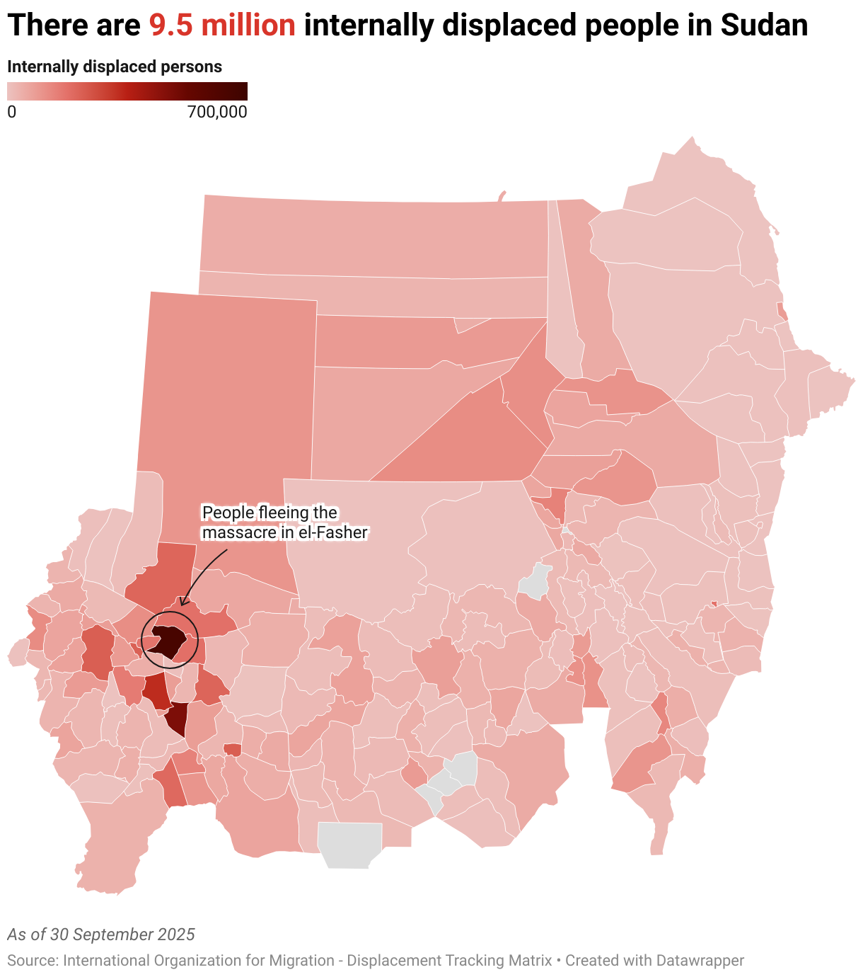 More than 9.5 million people are classified as internally displaced, having fled violence. The International Organization for Migration reports that North and South Darfur states host the largest number of internally displaced people, followed by Central and East Darfur states. Meanwhile, over 4 million have fled to the neighboring countries of Egypt, South Sudan, and Chad.