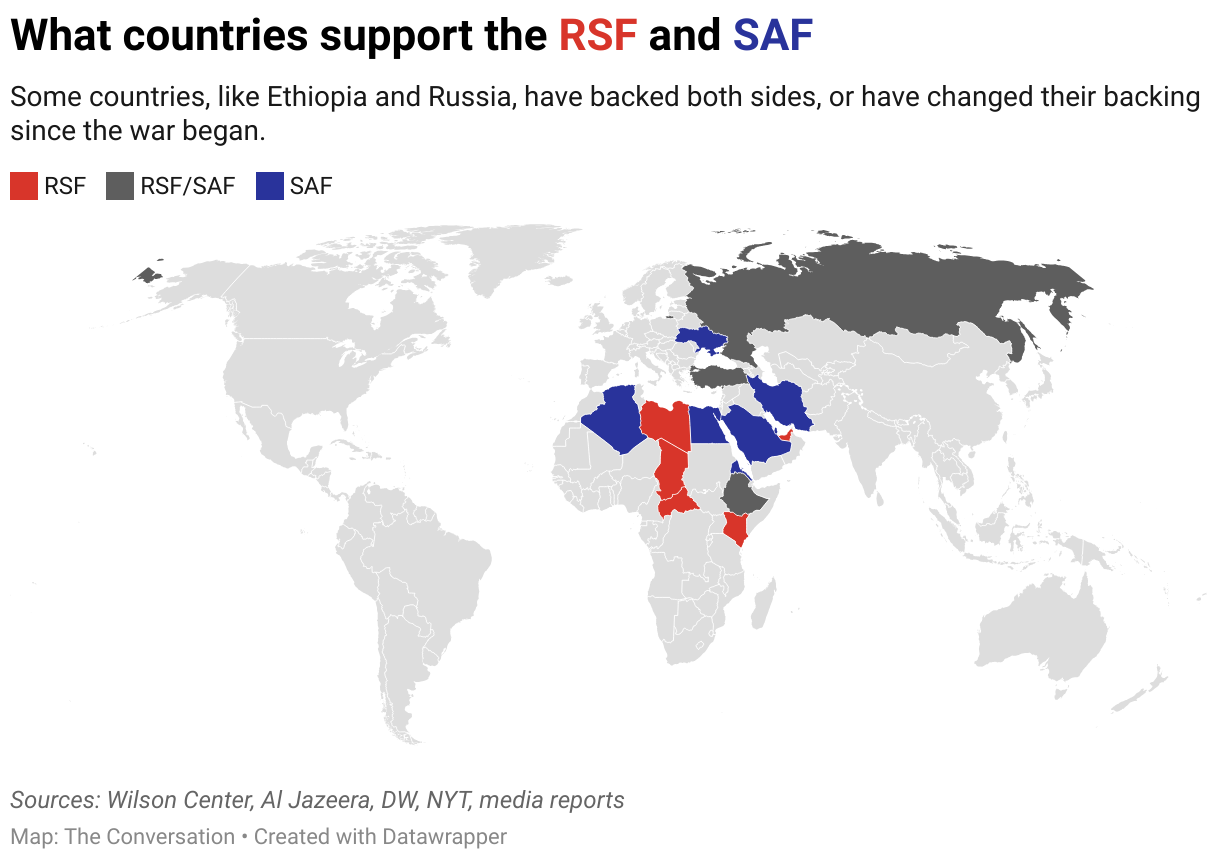 Saudi Arabia, which sees Sudan as an ally to counter Iran’s regional influence, has provided financial support to the SAF. In October 2025, the SAF-backed government announced that Saudi Arabia planned to invest an additional US$50 billion into Sudan, on top of the $35 billion it has already invested.